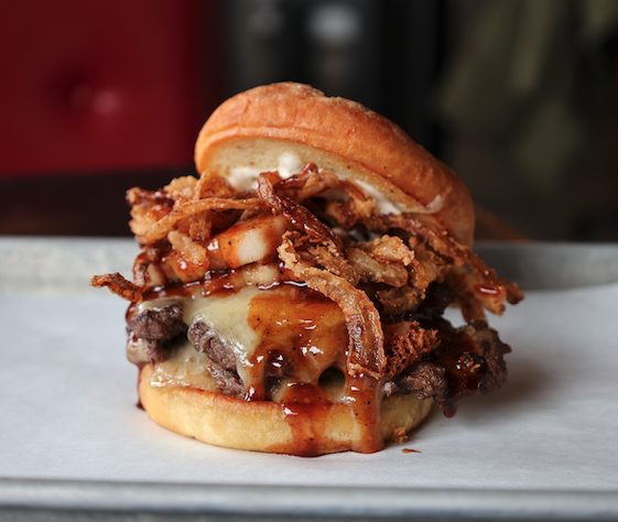 Smash Me Baby One More Time- Potato Bun, Double Smashed Burger Patties, White Cheddar, Pork Belly, Crispy Tobacco Onions, Agave BBQ & Ranch