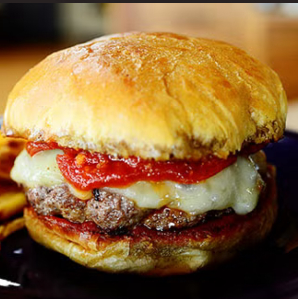 $7 PIZZA BURGER aka the BURGERIZZA: our delicious 1/3lb burger topped with provolone cheese, marinara sauce, pepperoni, and shaved Parmesan cheese, served on a garlic butter toasted brioche bun.