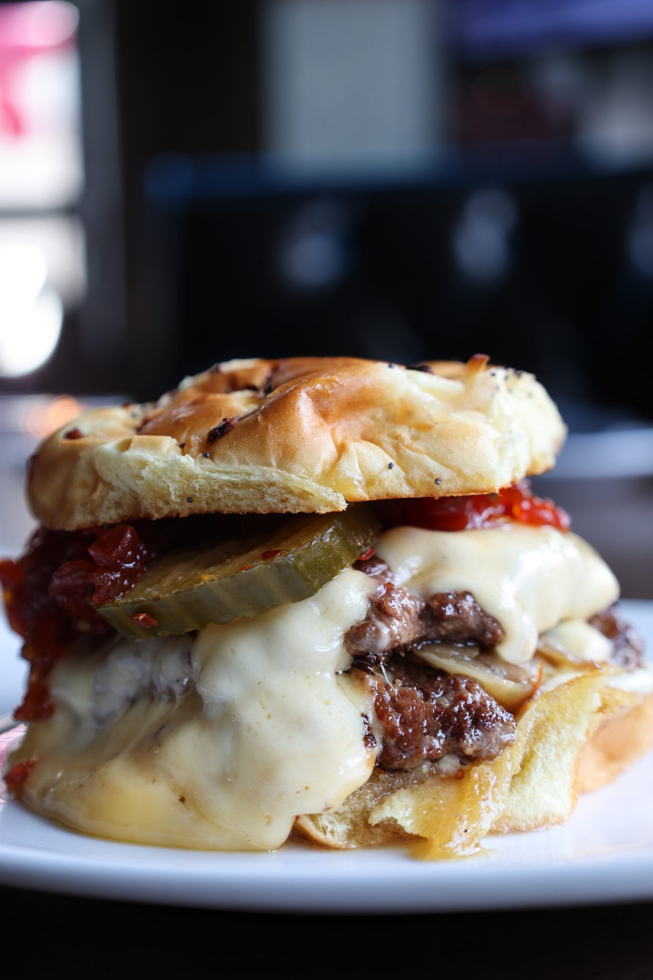 $8 The Smokin’ Sally - Double smashburger, Two crispy-edged smash patties, Butterkäse cheese – creamy, buttery perfection, Smokey tomato jam – rich, tangy, and a little spicy, Caramelized onions – golden and savory, House mustard – bright and tangy, Garlic aioli – smooth and garlicky, Crisp dill pickles – for that essential crunch, toasted onion bun