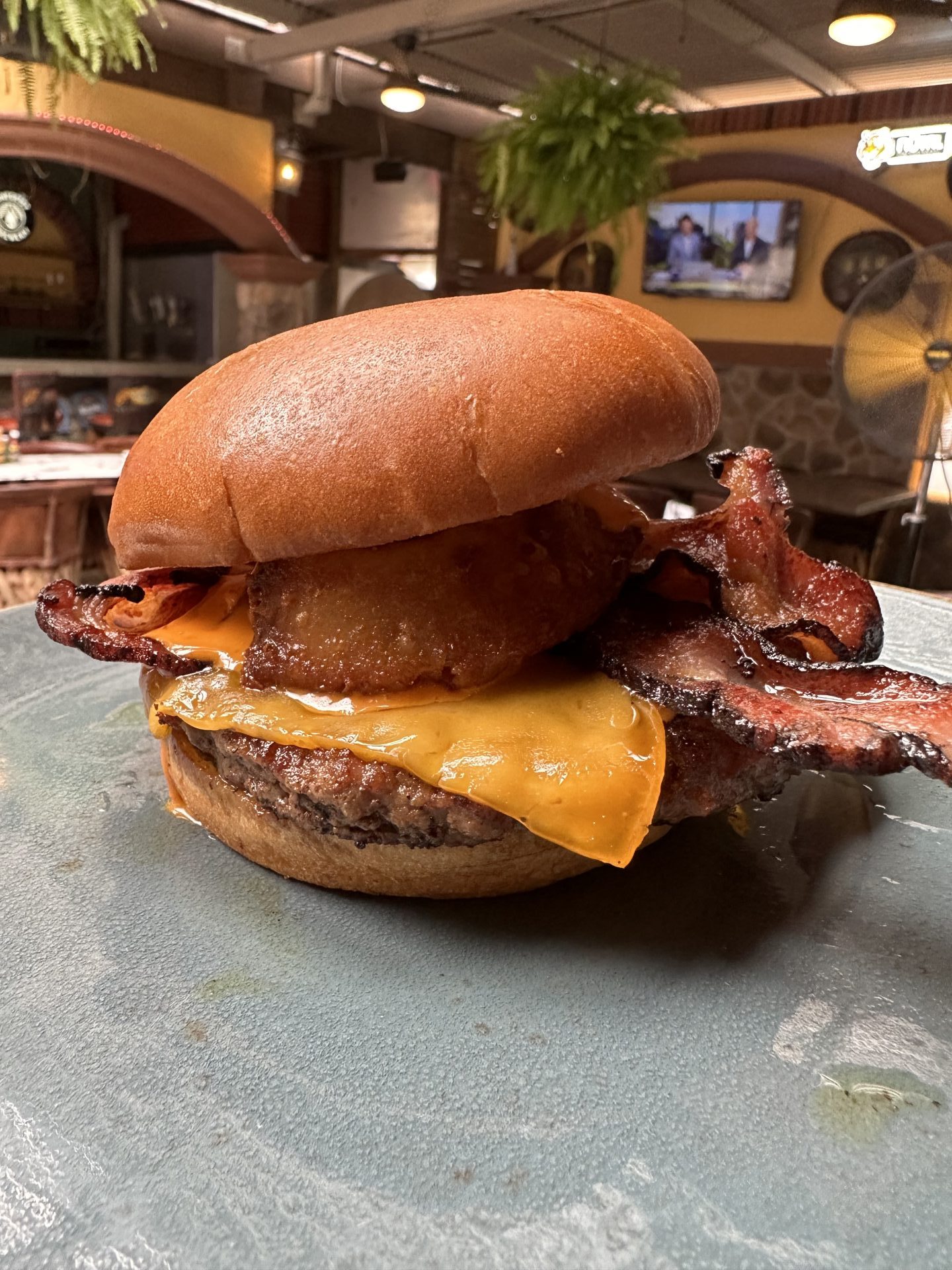EL BARRIL BURGER :5oz burger patty with smoked bacon onion ring mayo and boom boom sauce