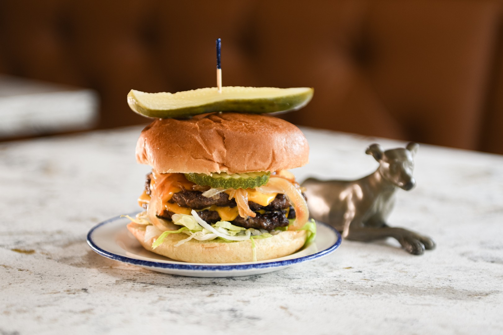 $8 Greyhound Onion Burger - Two smashed patties grilled with caramelized onions, American cheese, house-made dill pickles, and burger sauce on a toasted brioche bun.