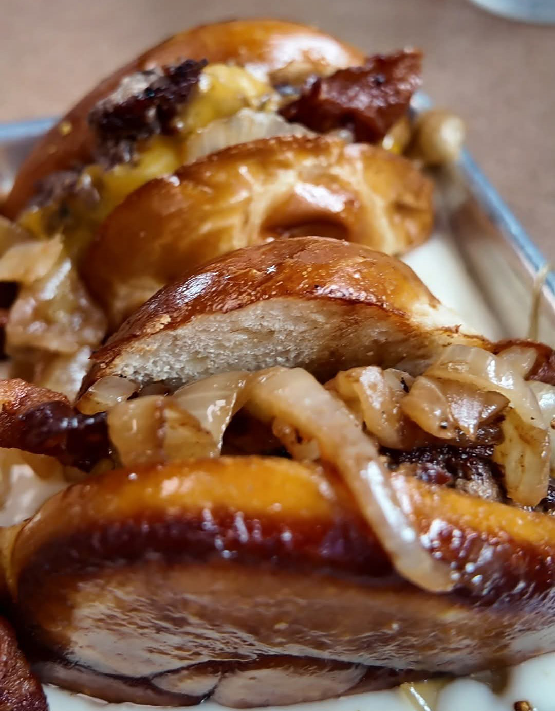 The Big E: The custom five steak blend burger topped with sauteed onions, cheddar cheese, and bacon on an Eric's Pretzel bun and served with a side of queso.