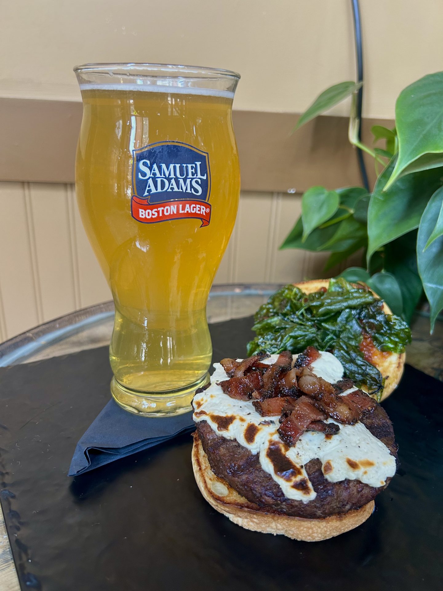 $8 Jammin' Goat Burger - Brioche, herb goat cheese, tomato jam, candied bacon, crispy spinach