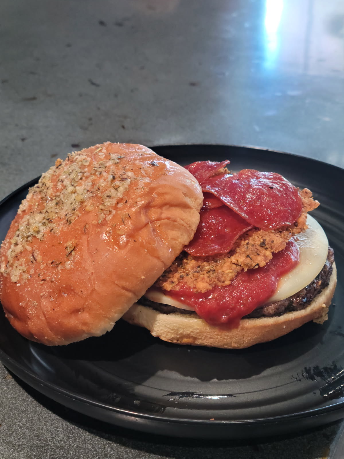 Pizza Burger: Provolone, Pizza Sauce, Burger and Bun