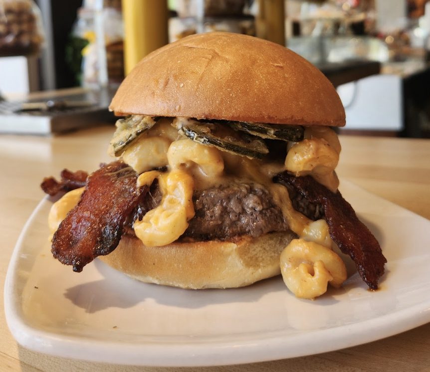 $8 Mac Burger - 7oz beef patty, mac & cheese, hot sauce aïoli, candied bacon, fried jalapeño slices, brioche bun